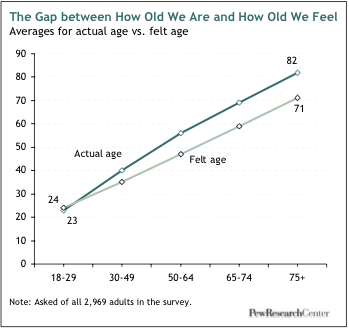 Pew Research Center found, in 2009, that "the older people get, the younger they feel – relatively speaking - with nearly half of all survey respondents aged 50 and older say they feel at least 10 years younger than their chronological age."
